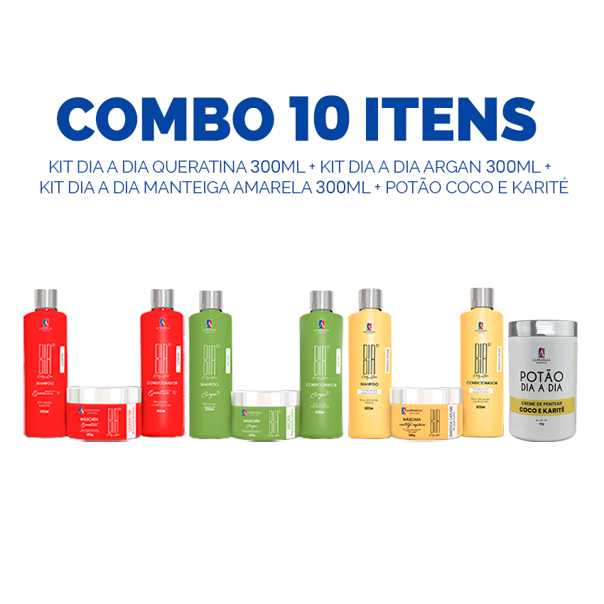 O Combo 10 Itens Alphahall combina os três kits essenciais do Dia a Dia com um creme de pentear para quem busca fios alinhados, macios e com frizz controlado.
