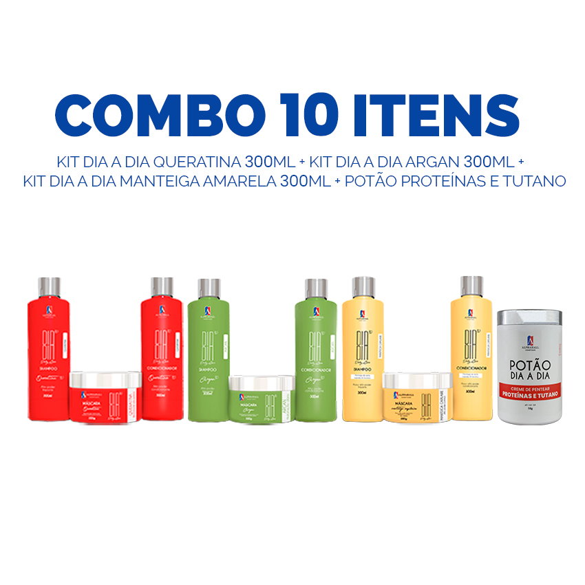 Quer praticidade e resultados visíveis desde o primeiro uso? O Combo 10 Itens Alphahall reúne os três tratamentos essenciais do Dia a Dia com um creme de pentear potente para brilho e revitalização dos fios.